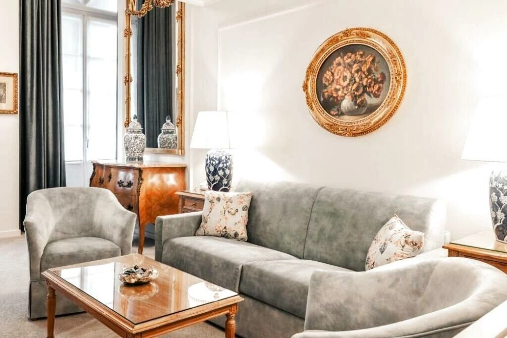 De kamers zijn ingericht in Louis XVI-stijl en bieden moderne comfortvoorzieningen zoals airconditioning, kabel-tv, minibar en gratis wifi. De marmeren badkamers hebben bad en afzonderlijke douche, badjas en haardroger; sommige kamers hebben zelfs een privéterras om rustig een glas te drinken na een dag sightseeing. Het hotel heeft een eigen bar waar je kunt ontspannen, en het ontbijtbuffet in de ontbijtruimte geeft voldoende keuze om de dag te beginnen.
